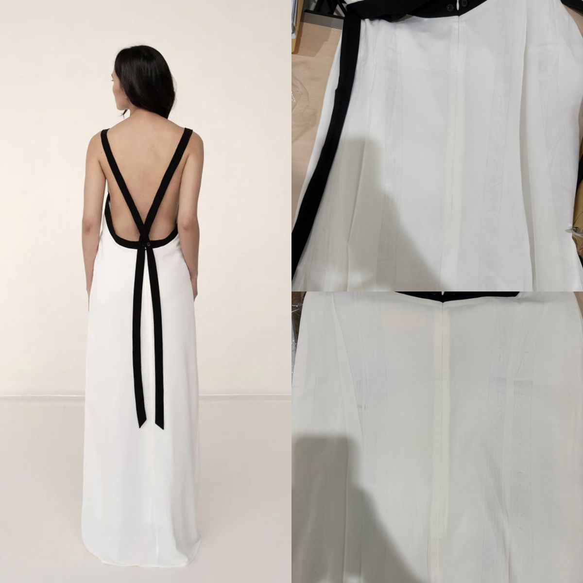 The Elvira dress is a chic white shift dress with black lining and adjustable straps that can be buttoned for multiple styling options, from halter to one-shoulder. Featuring a low backless design and a back zipper, Elvira offers a sleek and versatile look for any occasion.