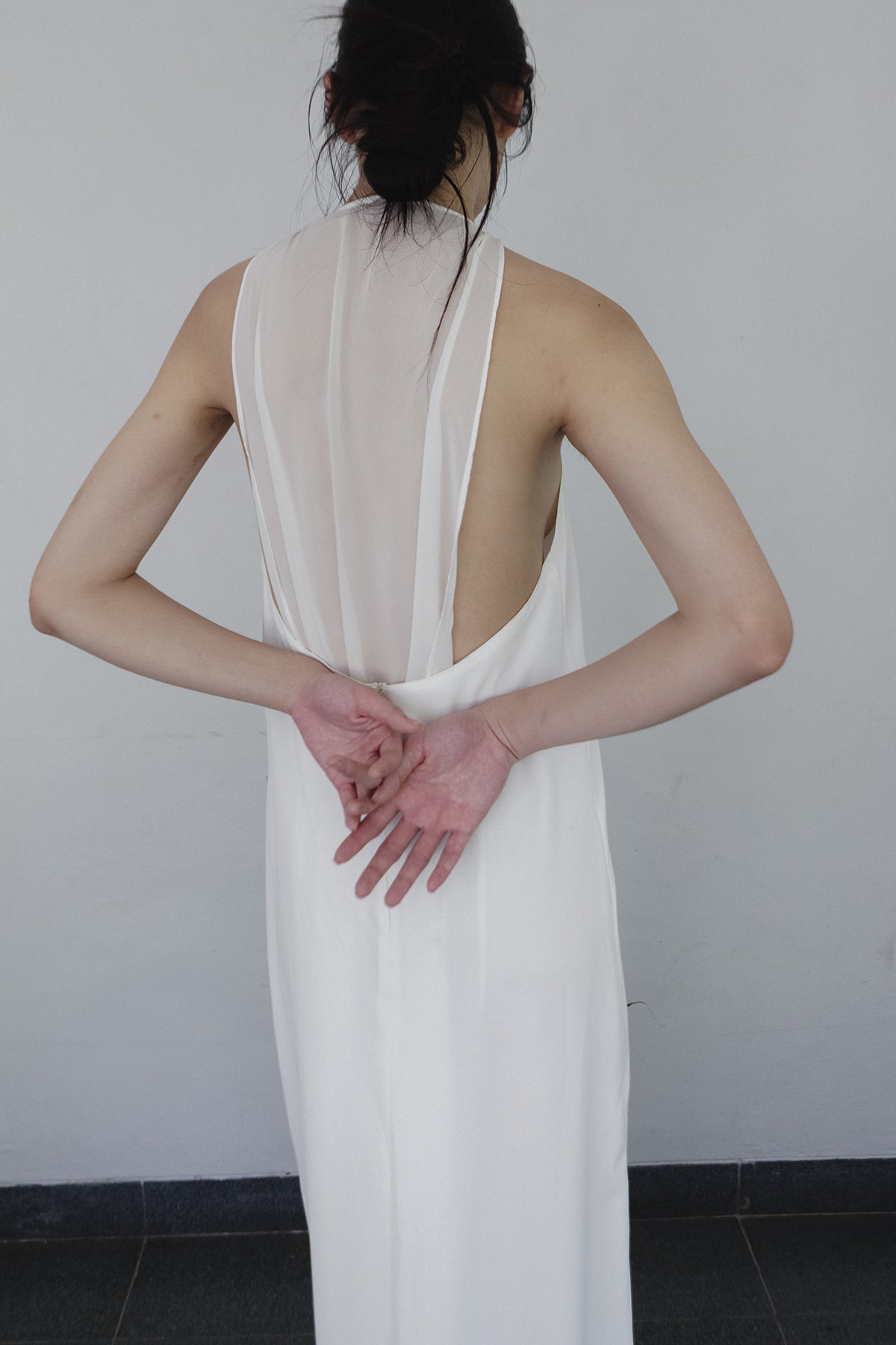 Luna is a stunning maxi dress featuring a deep V-neckline and a low-backless design, elegantly accentuated by a sleek back zipper for a flawless fit. Available in classic black and white, Luna is finished with a flowing sheer cape that adds a touch of sophistication. Crafted with double lining, it ensures both structure and comfort, making it perfect for any occasion.