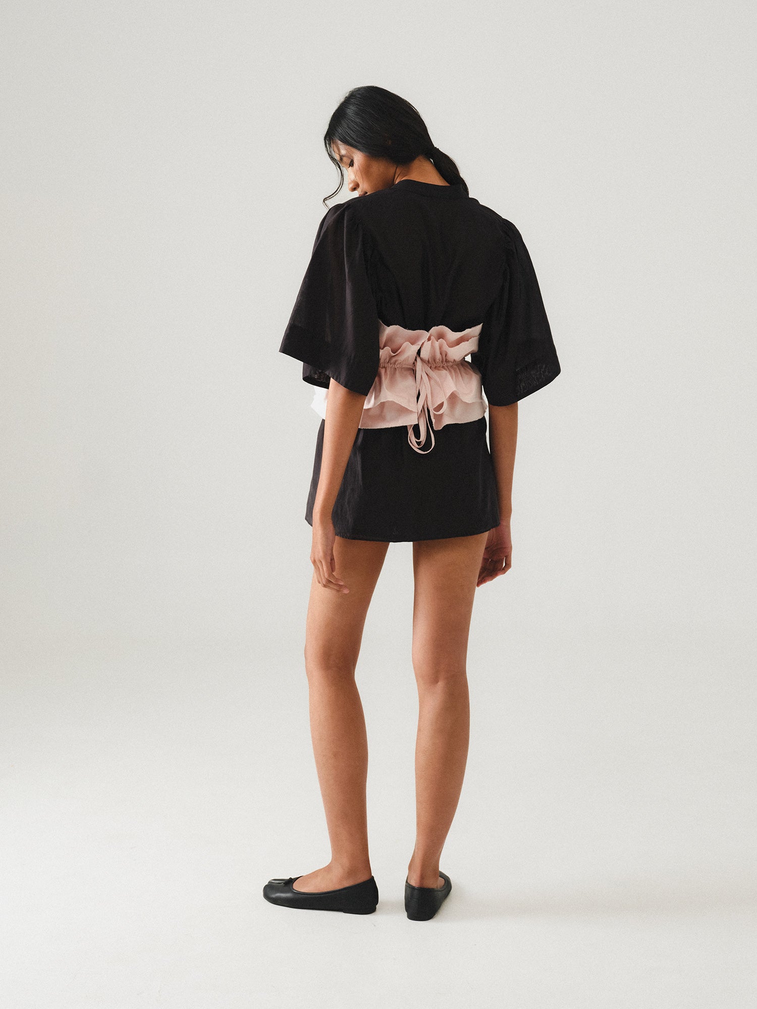 Nana is a scrunched tube top with adjustable ruching, allowing easy changes to fit and style. Nana have unfinished details on both layers. Constructed from structured cotton in red, pink, lime, and black, it is comfortable and easy to wear. Nana can also be worn as an obi belt, offering simple versatility and pairing well with both lolita and dilla pants.